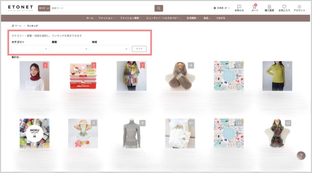 全国約2万店のエトワール会員様の購買データをもとに、70万アイテムの売上ランキングを見ることができます。ランキングでは「商品カテゴリー」「地域」「業種」別に絞り込むことができ、全国の同業種の方がどんなアイテムを仕入れているかをご覧いただけます。