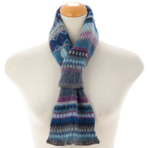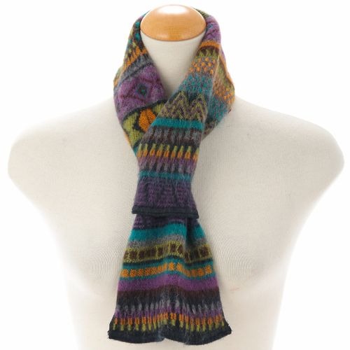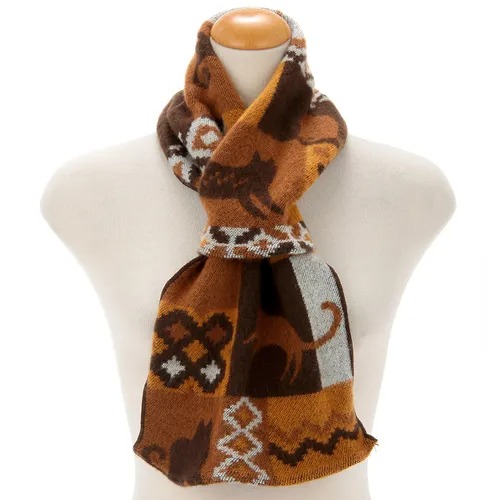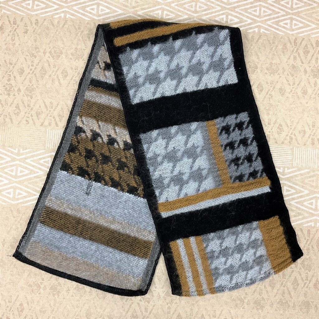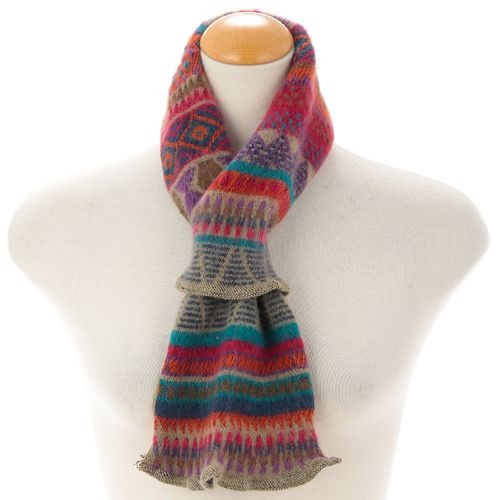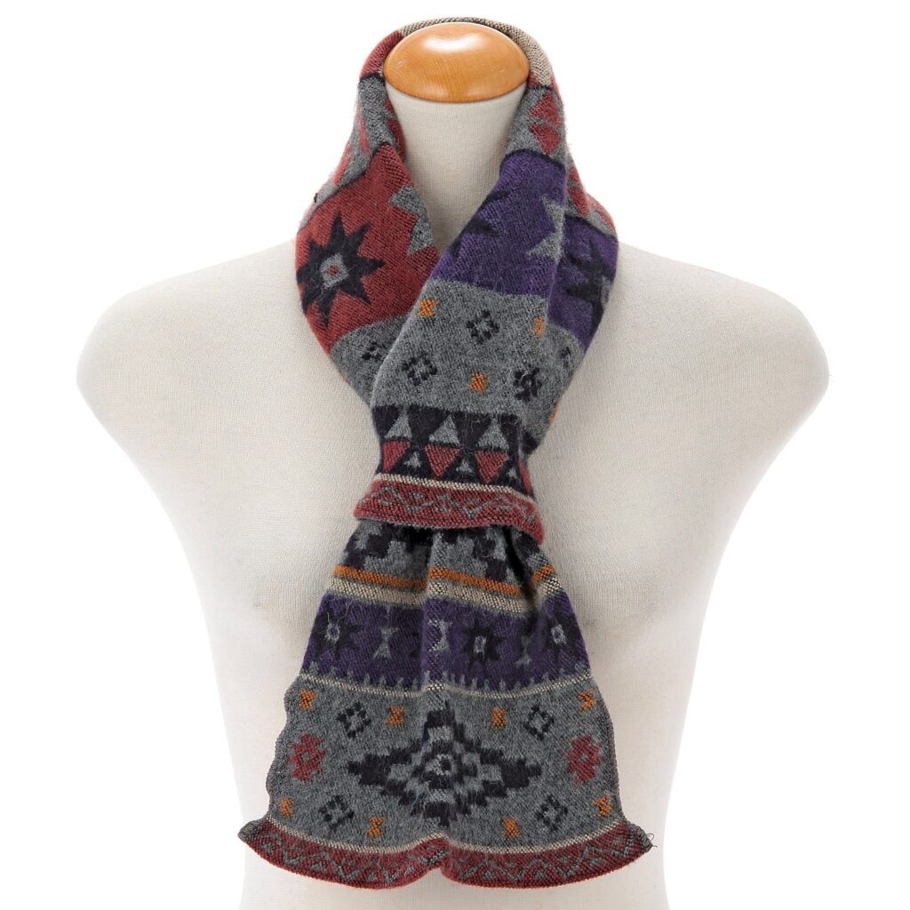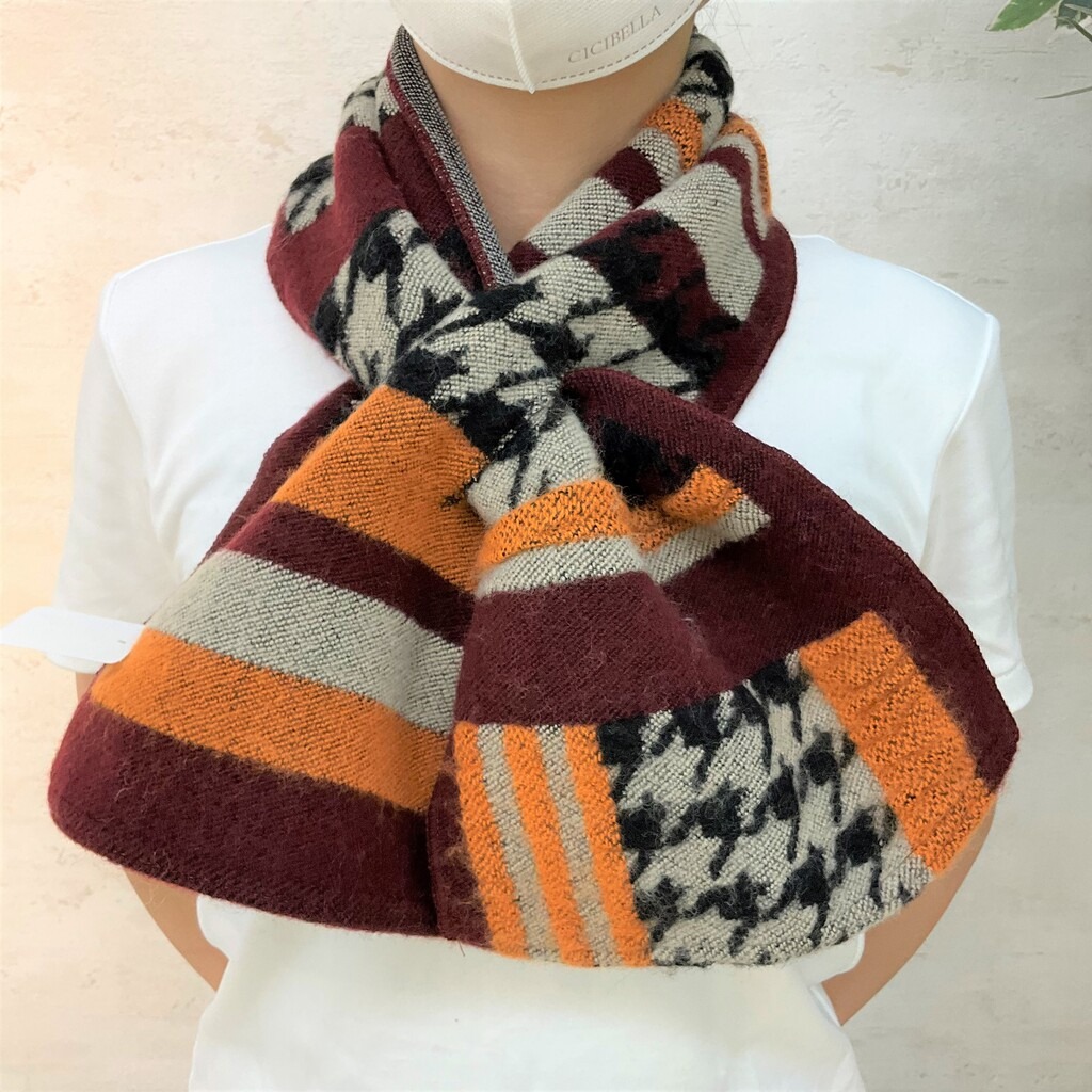 巻き方のアレンジ次第で、柄の見え方や全体の雰囲気をガラッと変えることができます。こちらはフリンジが付いているので、他の型のマフラーとはまた違った味わいが楽しめます。