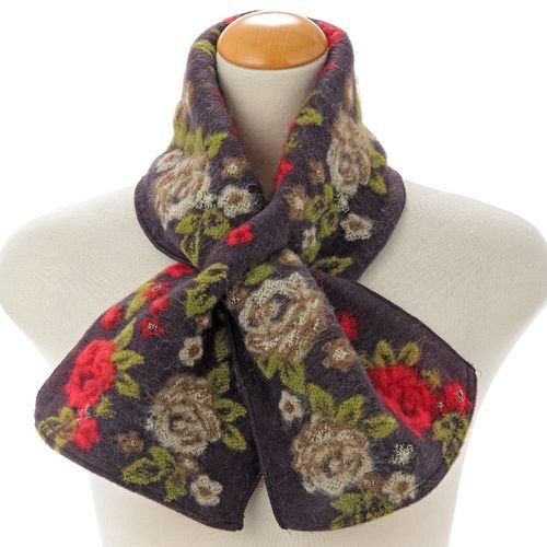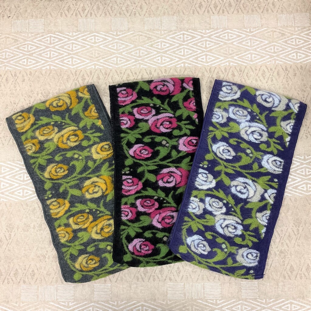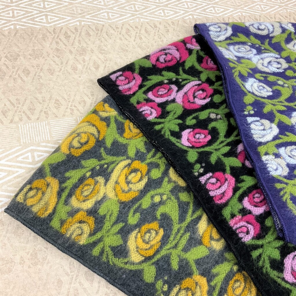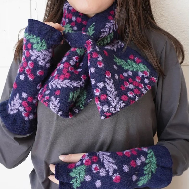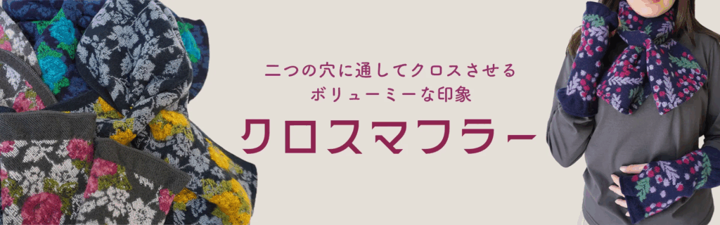 ダブルローズはプチマフラー、クロスマフラー、ハンドウォーマーの3型をご用意しています。他の柄は2型展開が中心のため、3型が揃うダブルローズは、コーディネート提案の幅が広がるシリーズになっています。