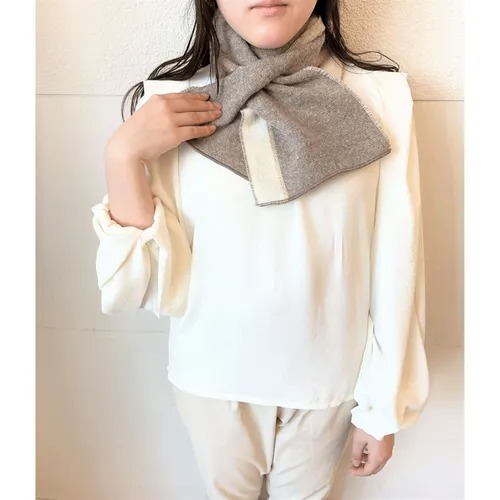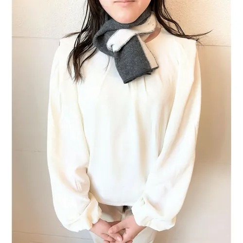 首にくるっと1周巻き、片側をスリットに差し込むタイプで、主張しすぎないコンパクトなシルエットが特徴です。生地は、すっきりとしたフォルムを追求するために、プチマフラーなど従来品よりもやや薄手ですが、アルパカ混の素材を使用しているため、薄くてもあたたかく、やわらかな肌ざわりを実現しています。
