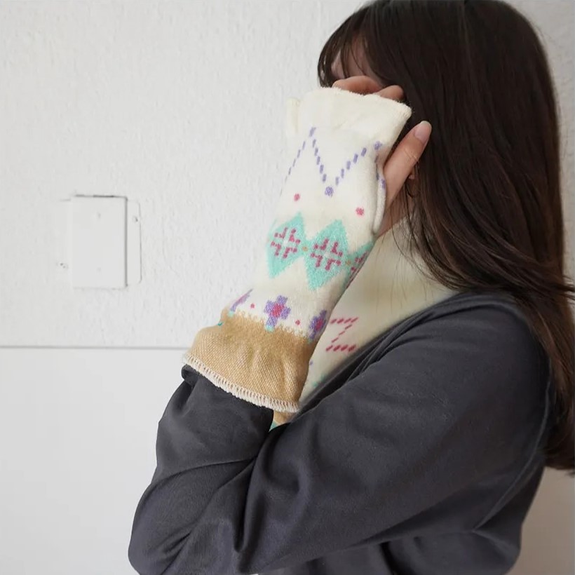 指なしタイプの筒状デザインで、手を通すだけでサッと着けられます。着けたままでも指を動かしやすく、スマホの操作やお会計などのちょっとした作業もそのままできるところもポイント。手首の上までしっかり覆うデザインなので、指先が出ていてもあたたかく、袖口からの冷気を防いでくれます。
