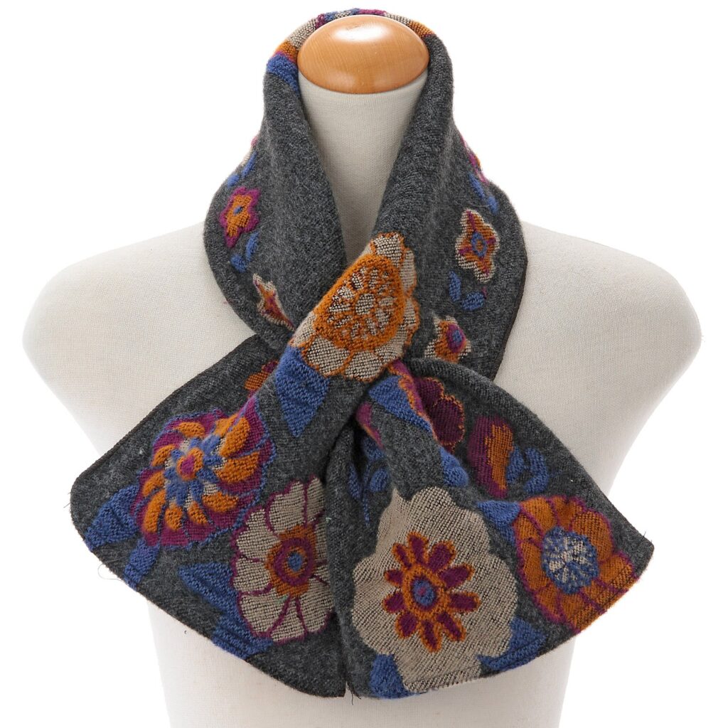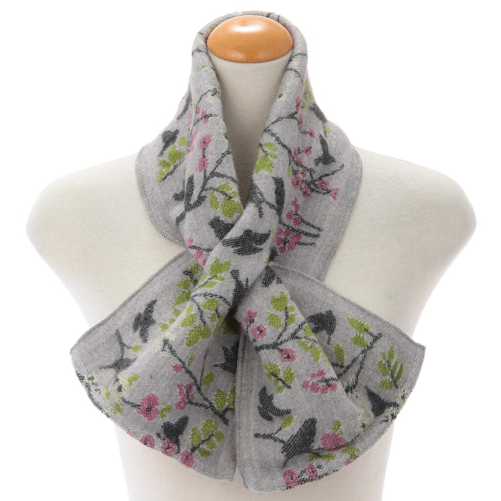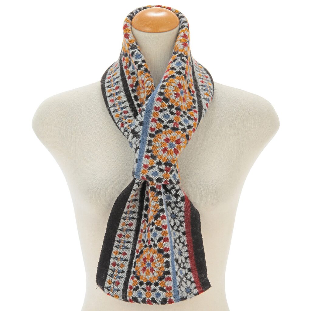クロスした両端が広がって見えるので、プチマフラーよりもボリューミーな印象を与えてくれます。片側にある2つの穴に、もう片側を差し込むタイプで、こちらもプチマフラーと同じく、簡単に綺麗な形を作ることができます。ラシクモアの鮮やかな柄をしっかりと見せてくれるので、シンプルなコーディネートに合わせると華やかアクセントになります。