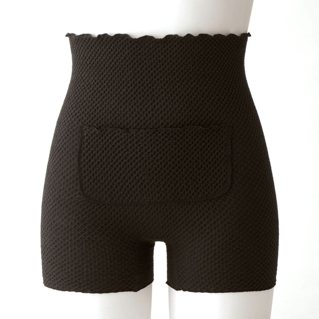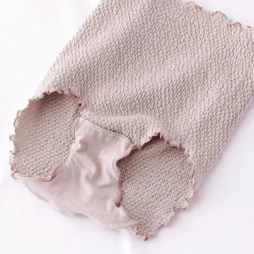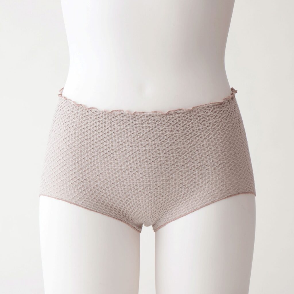 肌に触れる面はふんわりソフトな綿100%。オリジナル技術の鹿の子調の編みはタテ・ヨコ・ナナメ全方向に伸び、クッション性抜群です。ウエストも足口もゴムを使用せず、すべてメロー仕上げになっているため、締め付け感がありません。
