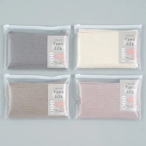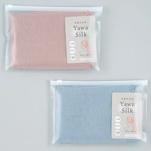 シルク100%の糸で編み上げた伸縮性のある枕カバー。裏側中央に穴をあけて、装着しやすくなってます。ツルツルの素材ではないので、冷たさもなく、優しい肌ざわりで、快適に眠ることができます。