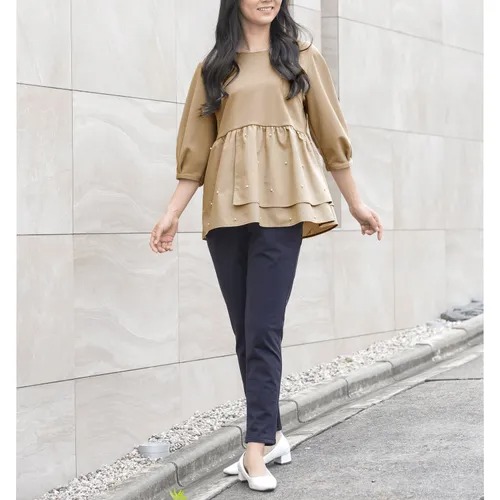 ウエストに切り替えがあり、裾に広がりをもたせたペプラムトップスが復活。