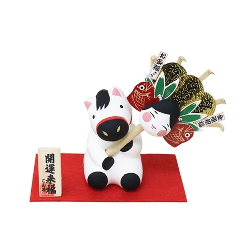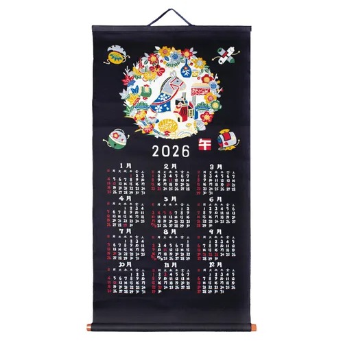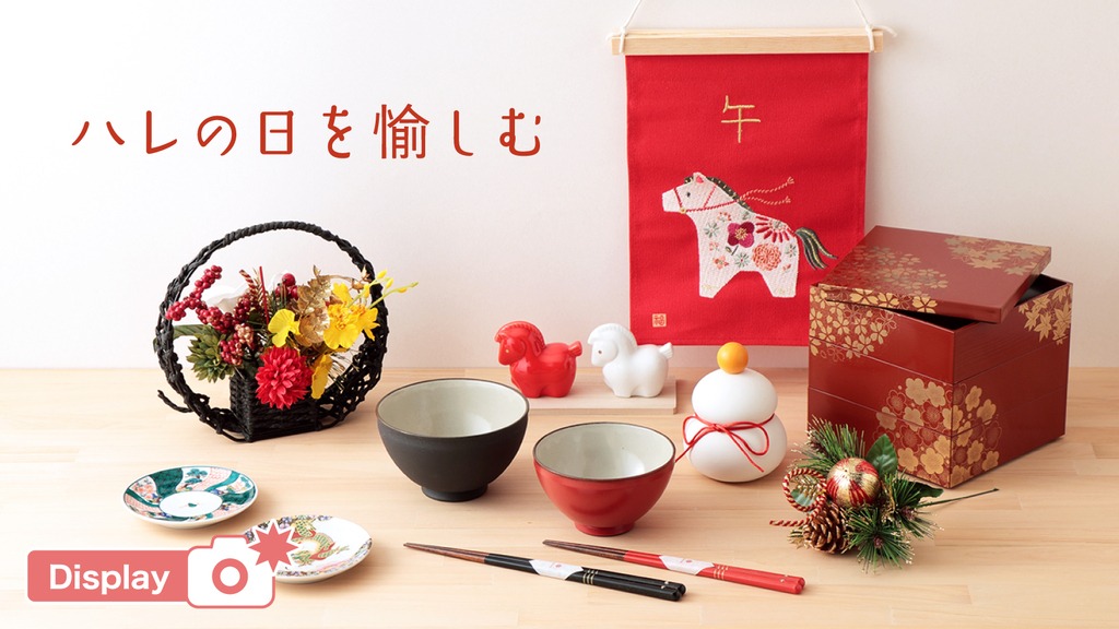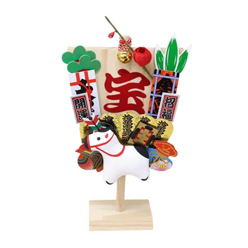 玄関・リビング・ダイニングなどに飾れる午モチーフの置き物やタペストリーは、簡単に新年の雰囲気を演出できる定番アイテム。木製・ガラス製・陶器製など素材の違いで印象が変わるため、インテリアのテイストに合わせて選べるバリエーションがあると売場で手に取られやすくなります。カレンダーや手拭いなど、実用的なアイテムも人気です。
