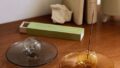 落ちる灰を受け止めるガラスの香立て