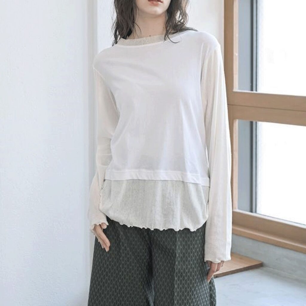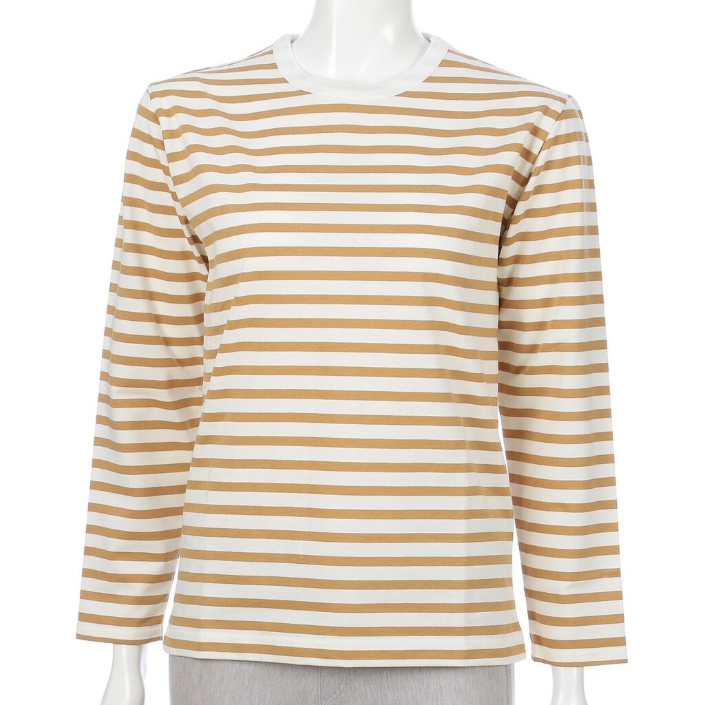 こちらのスタイリングでは、シアーインナーをネックからのぞかせることで、さりげない抜け感と奥行きをプラス。レイヤードならではの立体感が生まれ、カジュアルなボーダートップスも洗練された印象に変わります。